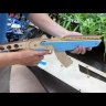 Резинкострел компании "Arma.toys" сделан из березовой фанеры, его длина со съемным прикладом - 60 см. Часть деталей покрашена в приятный голубой цвет нетоксичной и гипоаллергенной краской.